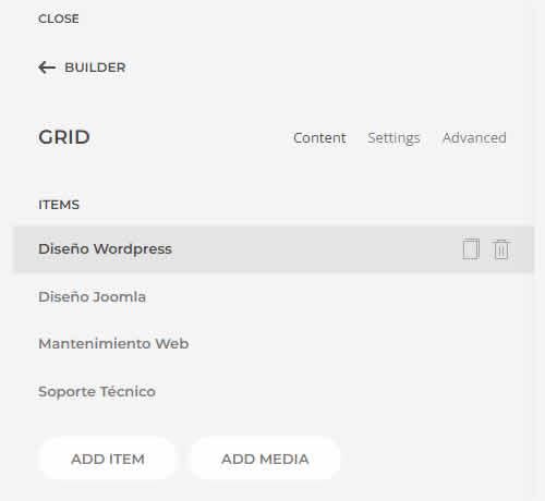 Los elementos de varios Items, como la Galería o la Cuadrícula (Grid o Gallery), permiten crear múltiples Items de contenido. La pestaña Content muestra la lista de todos los Items creados. Para editar un Item, simplemente haga clic en él. Se abrirá un panel donde podrá modificar el contenido y la configuración del elemento.