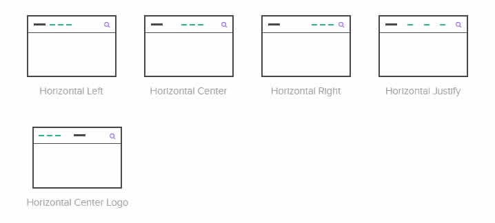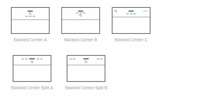 El logotipo, la barra de navegación y el encabezado se muestran uno encima del otro y centrados horizontalmente. En el diseño Stacked Center C, el encabezado se divide y se alinea a la izquierda y a la derecha, mientras que el logotipo se coloca en el centro. En ambos diseños Stacked Center Split, los elementos del menú de la barra de navegación se dividen y el logotipo se coloca en el centro.