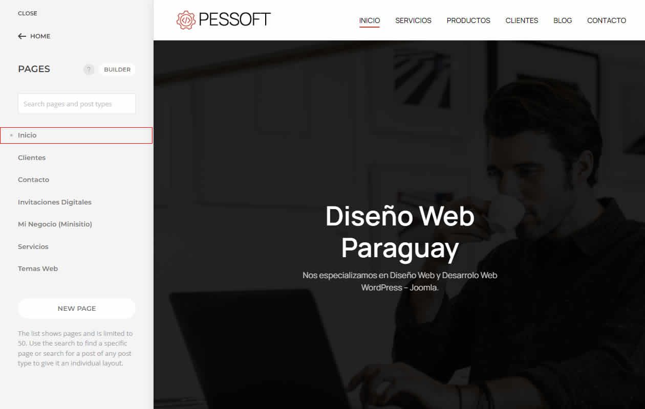 También se puede abrir el diseño de la página actual que se muestra en la vista previa haciendo clic en el botón BUILDER (Constructor) en la parte superior. Una vez abierto el constructor de páginas, al navegar por las diferentes páginas de la vista previa se abrirá automáticamente su diseño correspondiente.