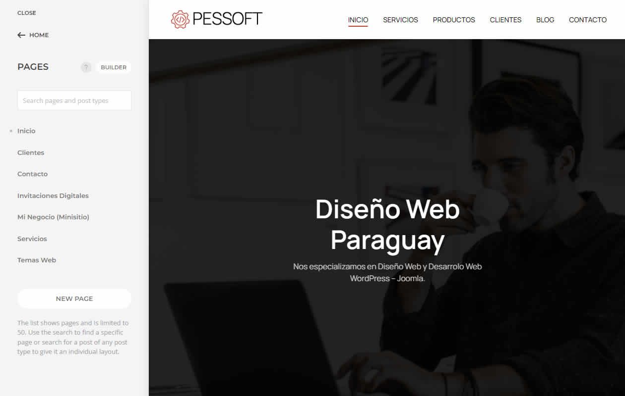 Para crear una página nueva, haga clic en el botón NEW PAGE. La página se guardará como borrador y deberá publicarse en el panel de administración de WordPress.