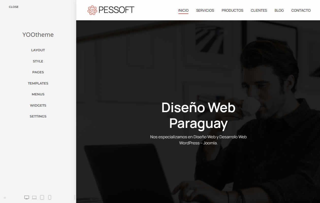 El personalizador de YOOtheme Pro se divide en una barra lateral a la izquierda y una vista previa en tiempo real a la derecha. La barra lateral permite navegar por los diferentes paneles de configuración de YOOtheme Pro.