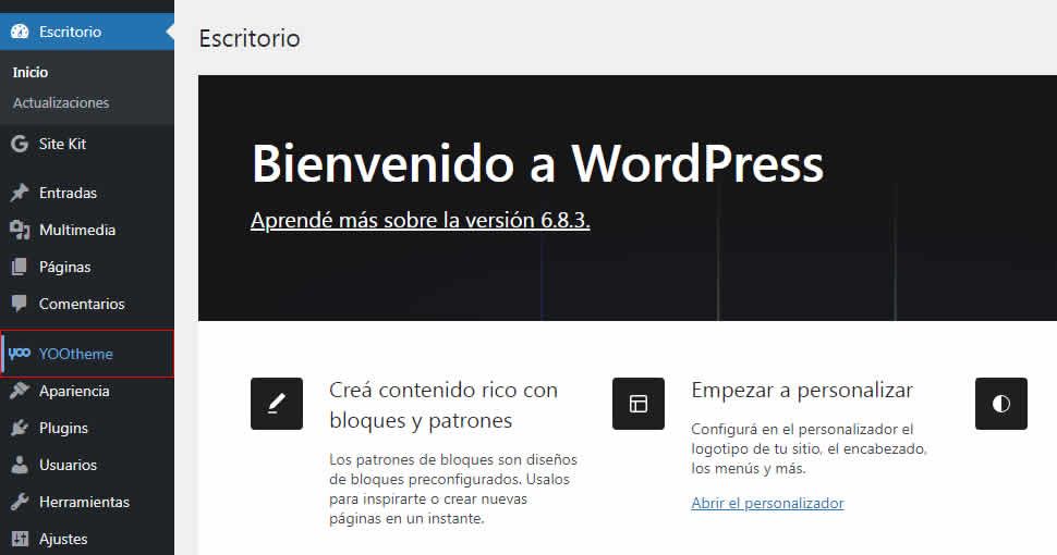 Para abrir el personalizador, haga clic en el elemento de menú YOOtheme Panel de administración de WordPress.
