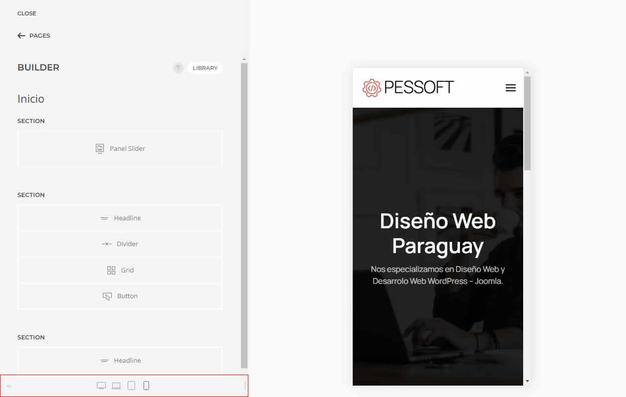 Los botones de vista previa para dispositivos se encuentran en la parte inferior de la barra lateral. Utilice los iconos de los dispositivos para comprobar cómo se ve su sitio web en diferentes tamaños de pantalla.
